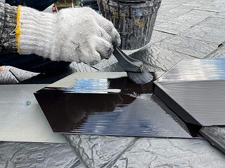 屋根水切りの錆止め塗装をしています。