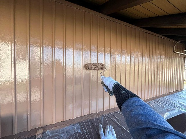 本日は、前日に中塗りを行ったトタン部の 上塗り を中心に施工しています。