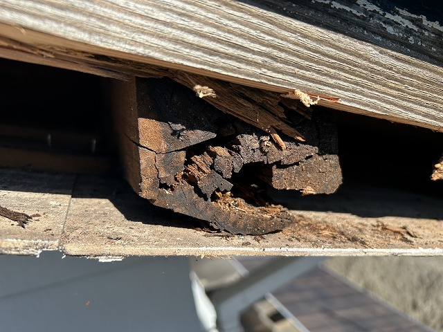 すると中の破風板と呼ばれる屋根のケラバ側端部の木が腐っており、更に一番端部の垂木までが腐食している状態でした。