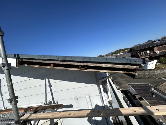 早速足場をかけて、破風板金を撤去。すると中の破風板と呼ばれる屋根のケラバ側端部の木が腐っており、更に一番端部の垂木までが腐食していました。