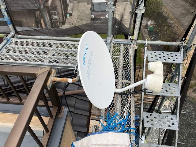 また、作業効率と安全性確保のため、スカパーアンテナや玄関スポットライトの一時撤去も行いました。