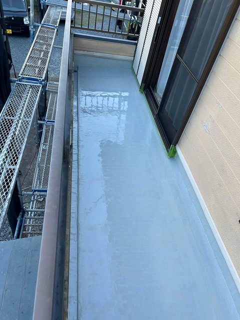 菊川市東横地のO様邸では、外壁塗装に先立ち、ベランダ床の補修と防水工事を実施しました。