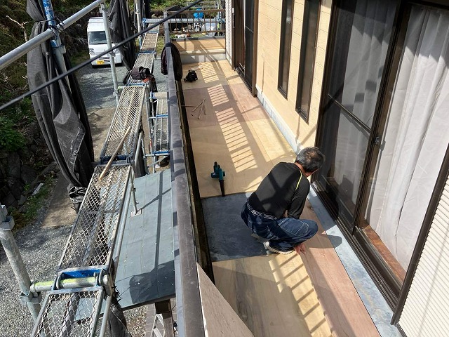 既存のベランダ床を補強するため、合板で増し張りを実施。