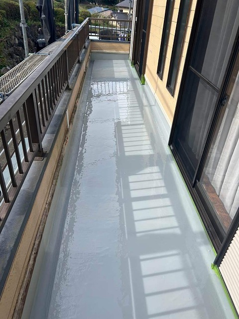 菊川市東横地のO様邸では、外壁塗装に先立ち、ベランダ床の補修と防水工事を実施しました。