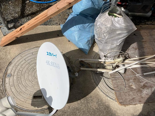 作業の妨げになるスカパーアンテナや玄関スポットライトを一時撤去。
