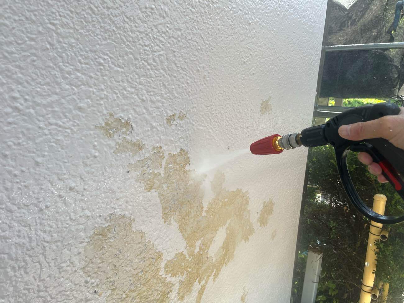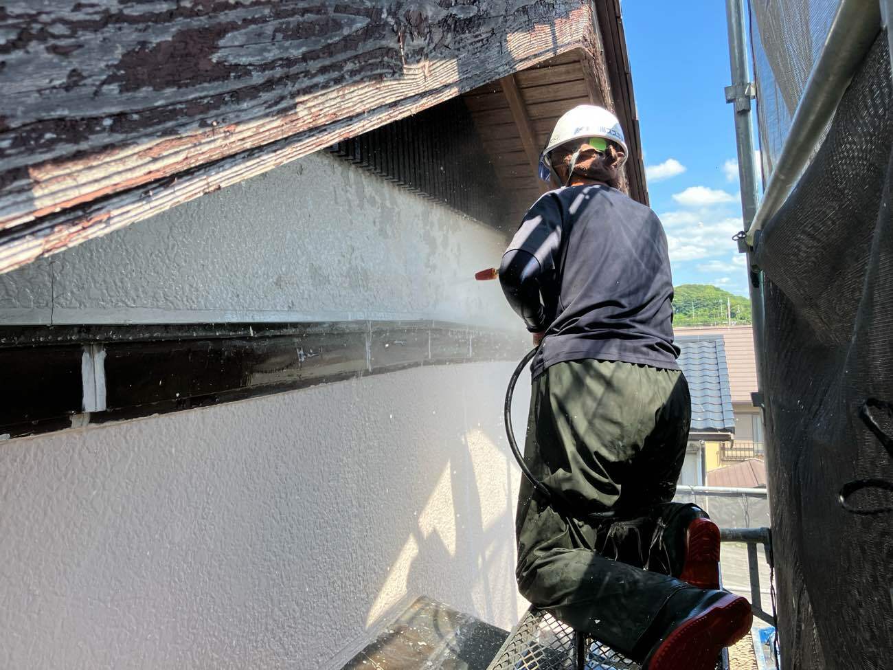 • <strong>高圧洗浄中</strong></br>無数に膨れていた塗膜は、大変脆弱になっており水洗浄で簡単に剥がれてしまいます 高圧洗浄中