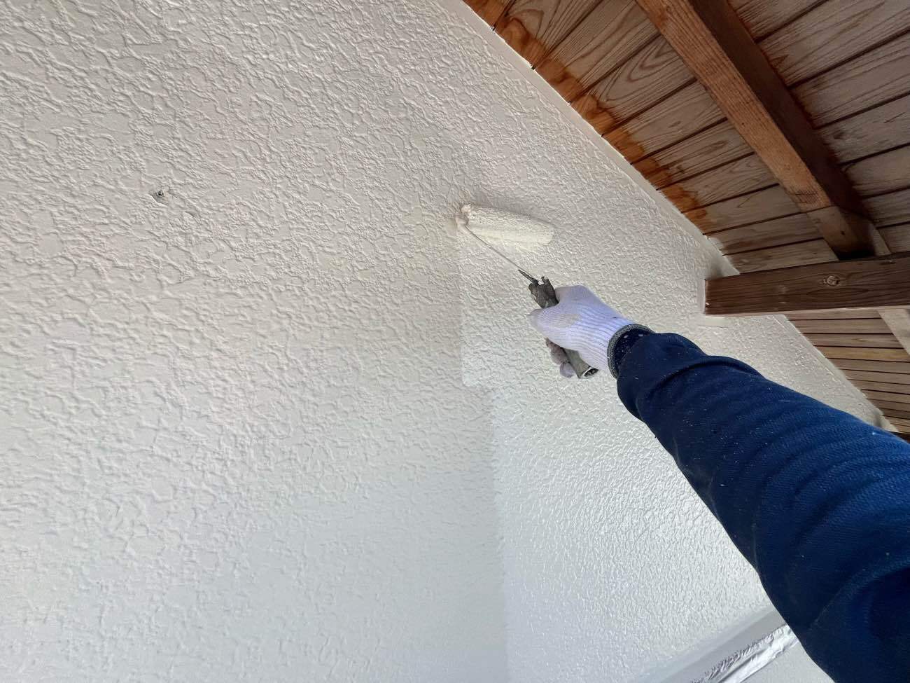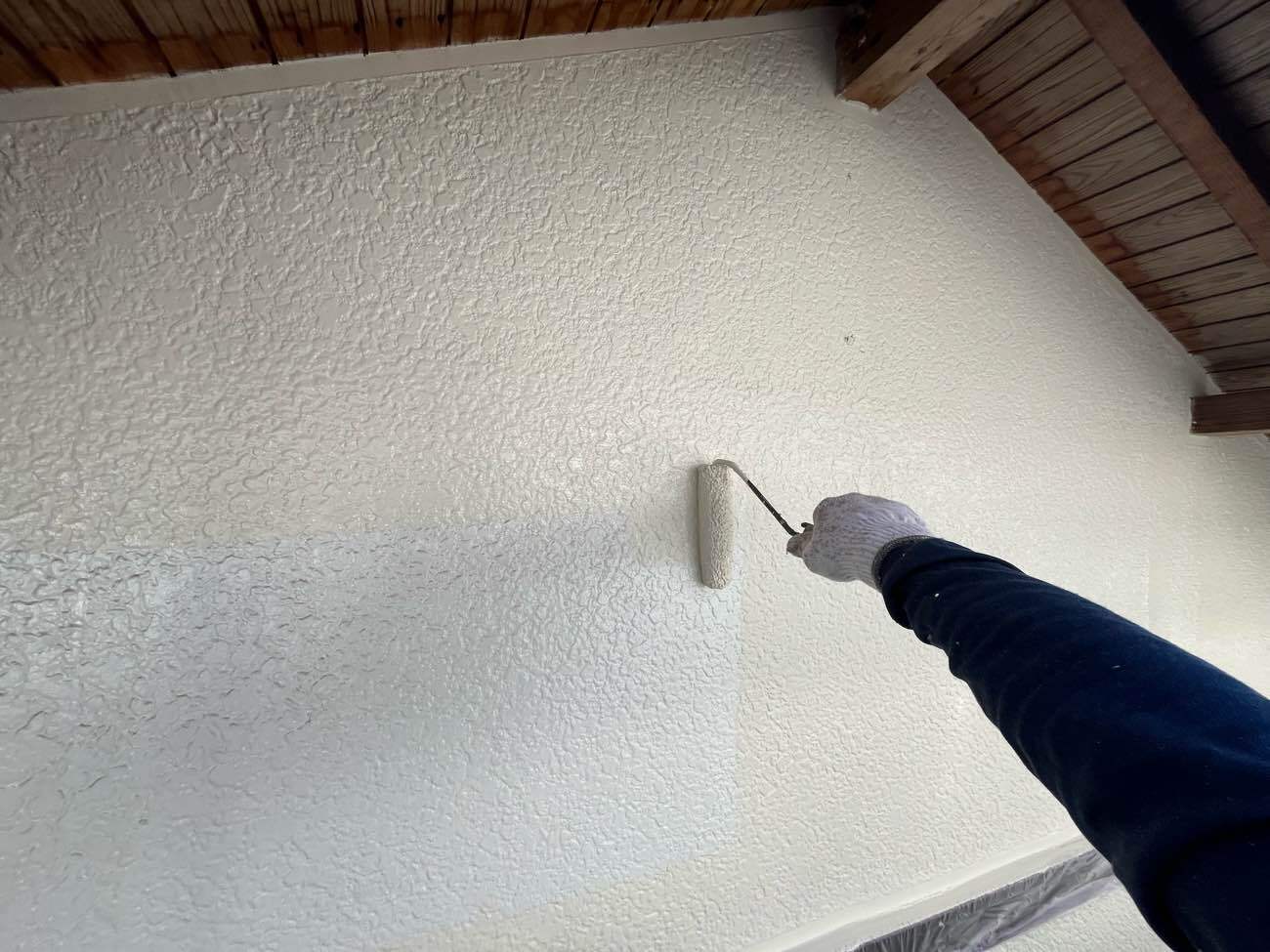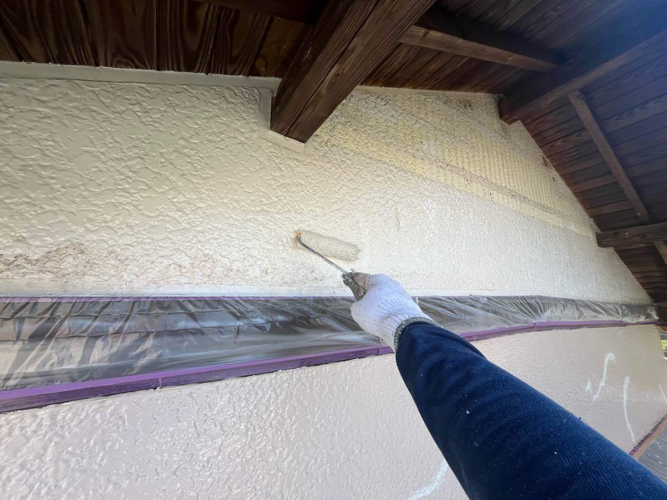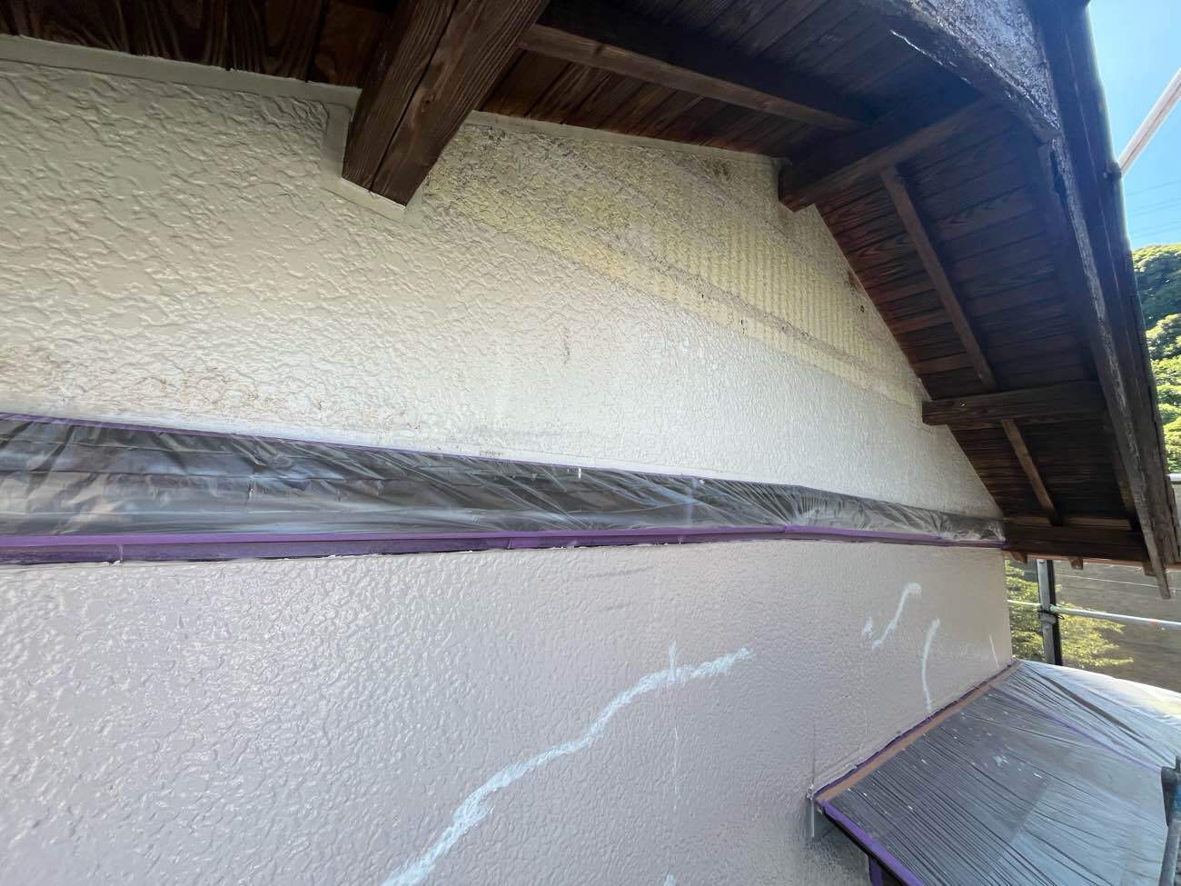 • <strong>妻部 中塗り塗装</strong></br>着色1回目です。ビーズコートSiにて着色していきます。塗膜への汚れが付着しにくい低汚染タイプのラジカル制御形シリコン塗装です。 妻部 中塗り塗装