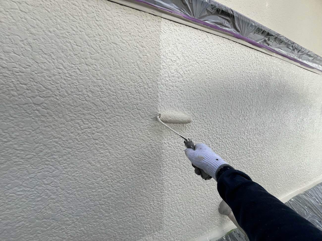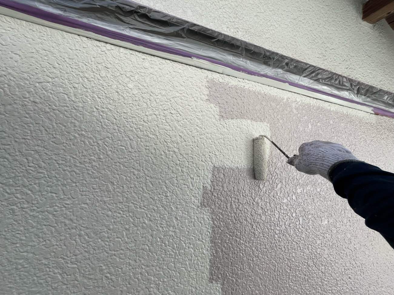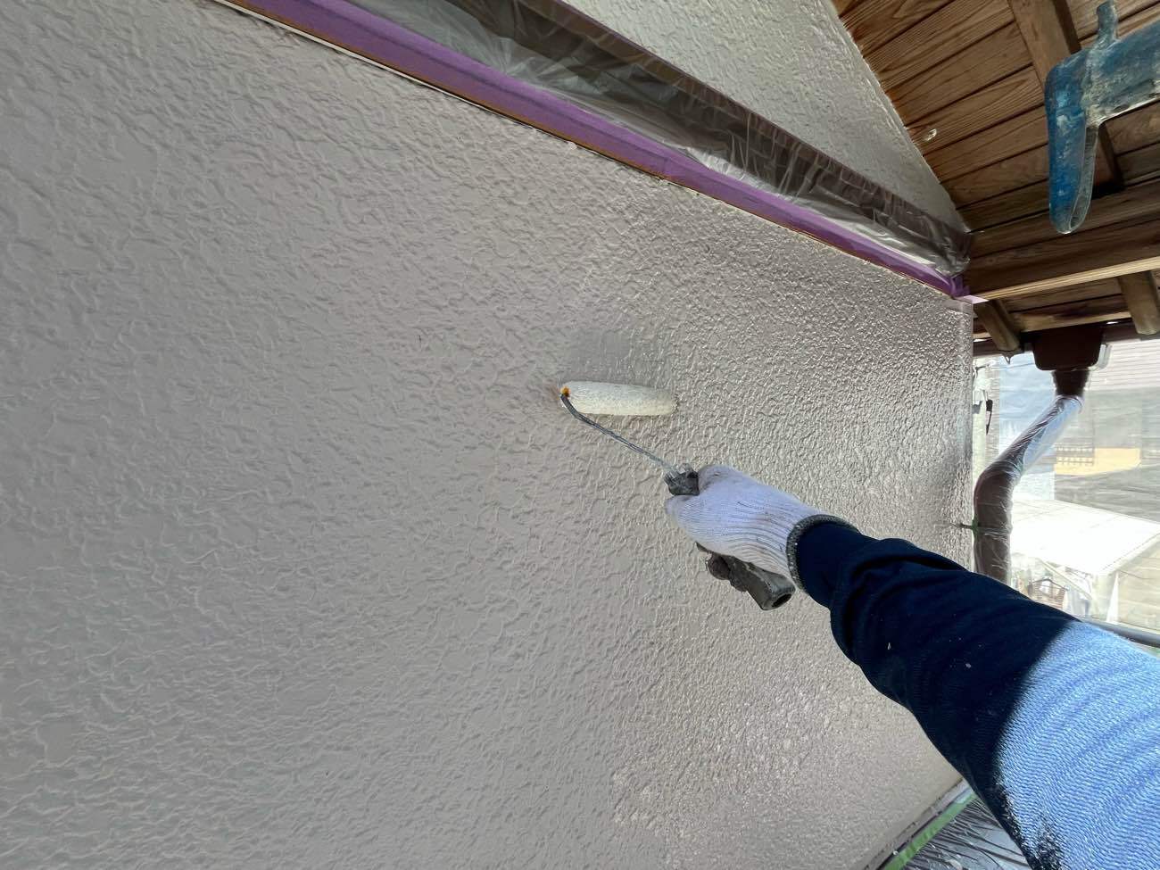 • <strong>中塗り塗装</strong></br>着色1回目です。ビーズコートSiにて着色していきます。塗膜への汚れが付着しにくい低汚染タイプのラジカル制御形シリコン塗装です。 中塗り塗装
