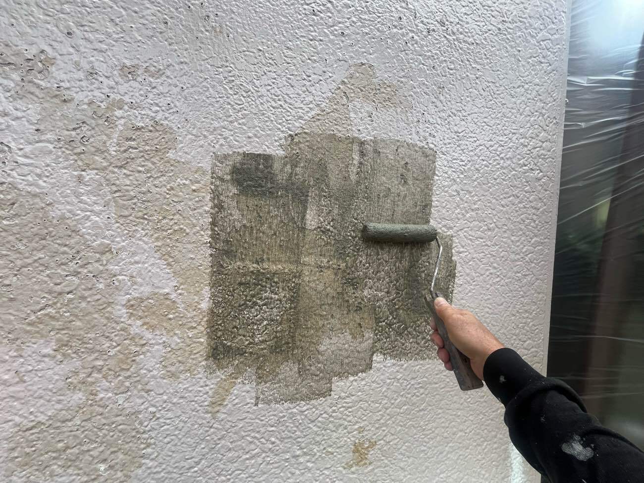 密着性を高めるアレス漆喰プライマーを塗装しました。 劣化した外壁には塗料が密着しにくいので、付着力の優れた下地材を入れて素地の補強を行います。