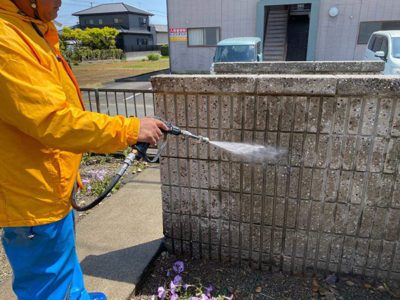【高圧洗浄】外壁 長年積もった汚れ、藻やコケ、チョーキングも完全に除去する事が目的です。 汚れの積もった下地には、塗料は密着せず、剥離などの不具合発生の原因になりますので、とても重要な工程です。