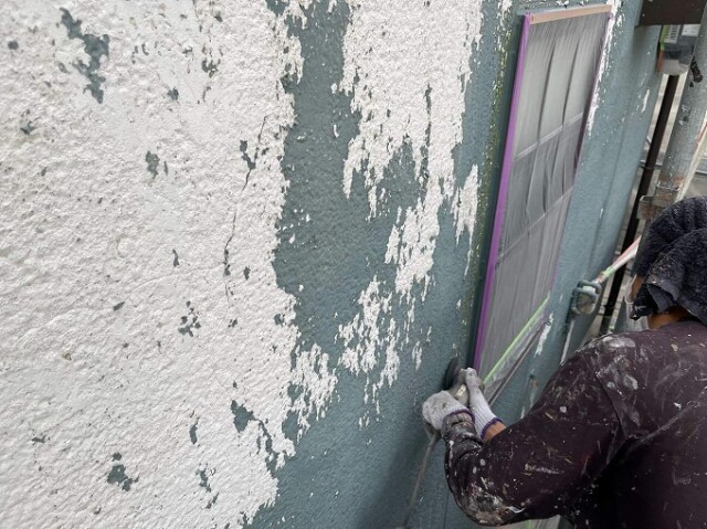 スタッコ壁(施工前) 細かな膨れが、無数に発生しています。 前回の工事で、何らかの原因により外壁の表面に塗膜がしっかり密着できずに、間に空気が入り込んで浮き上がってしまっている状態です。塗膜は胎くなっており、このまま塗装しても、塗装の目的である防水や、紫外線から守る機能を維持できませんので、膨れた部分は撤去する必要があります。