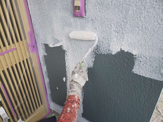 濃色部:スタッコ壁(中塗り塗装) 同じくラジカル制御塗料を施します。