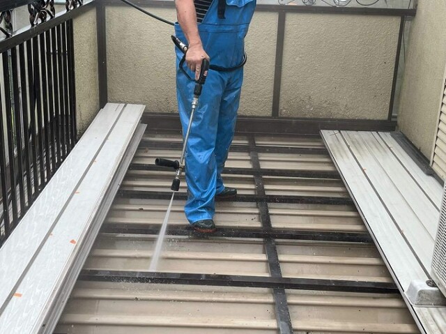 高圧洗浄 長年積もった汚れ、藻やコケ、チョーキングも完全に除去する事が目的です。 汚れの積もった下地には、塗料は密着せず、剥離などの不具合発生の原因になりますので、とても重要な工程です。