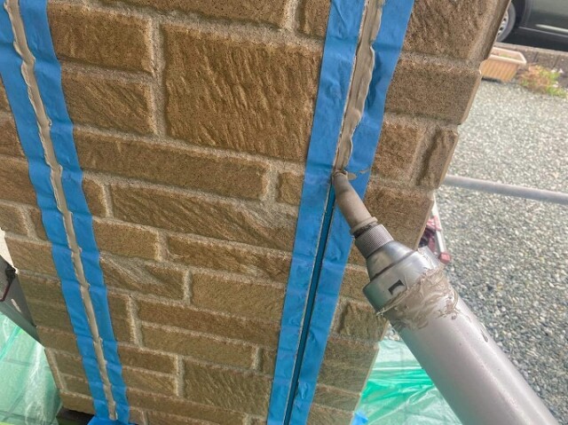 【外壁タイル調サイディング】 既存シーリング撤去 クリアー塗装した外壁は、塗装完了後、シーリング材を打設します。シーリング材がクリアー塗膜を汚染したり剥離させる場合があるからです。
