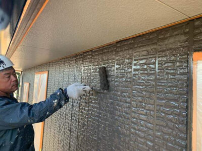 【外壁サイディング】下塗り塗装 塗料の密着効果を高める目的と、吸い込みムラを無くす為の塗装です。下地の痛み具合や材質、立地条件によって下塗り材の種類を変更しています。強靭な塗膜を作る為には、ここが一番のポイントになるからです。 <カチオン系 下塗り塗装> こちらにはカチオン系の下塗り材を塗装しました。 非常に小さい粒子により構成された樹脂であることから、基材や旧塗膜の奥深く浸透して、アンカー効果を発揮し、接着面の強化や上塗り塗材との付着性を高めます。